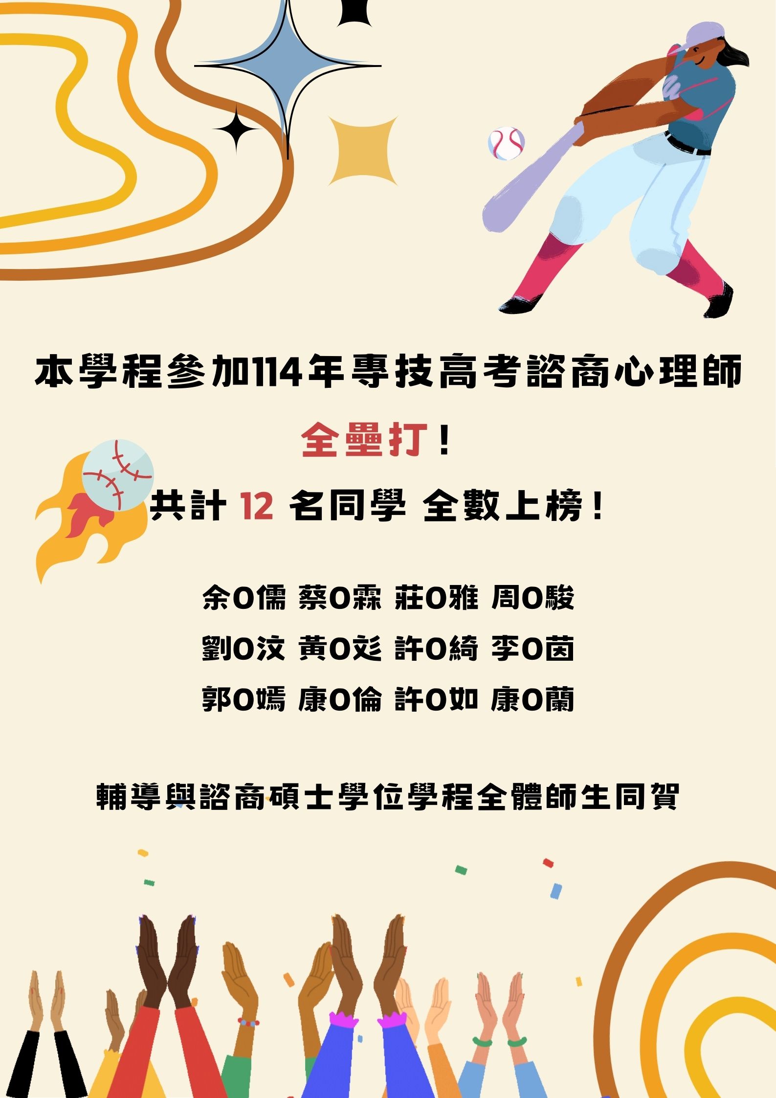 賀輔諮碩學程余O儒等12人考取114年專門職業與技術人員高等考試諮商心理師